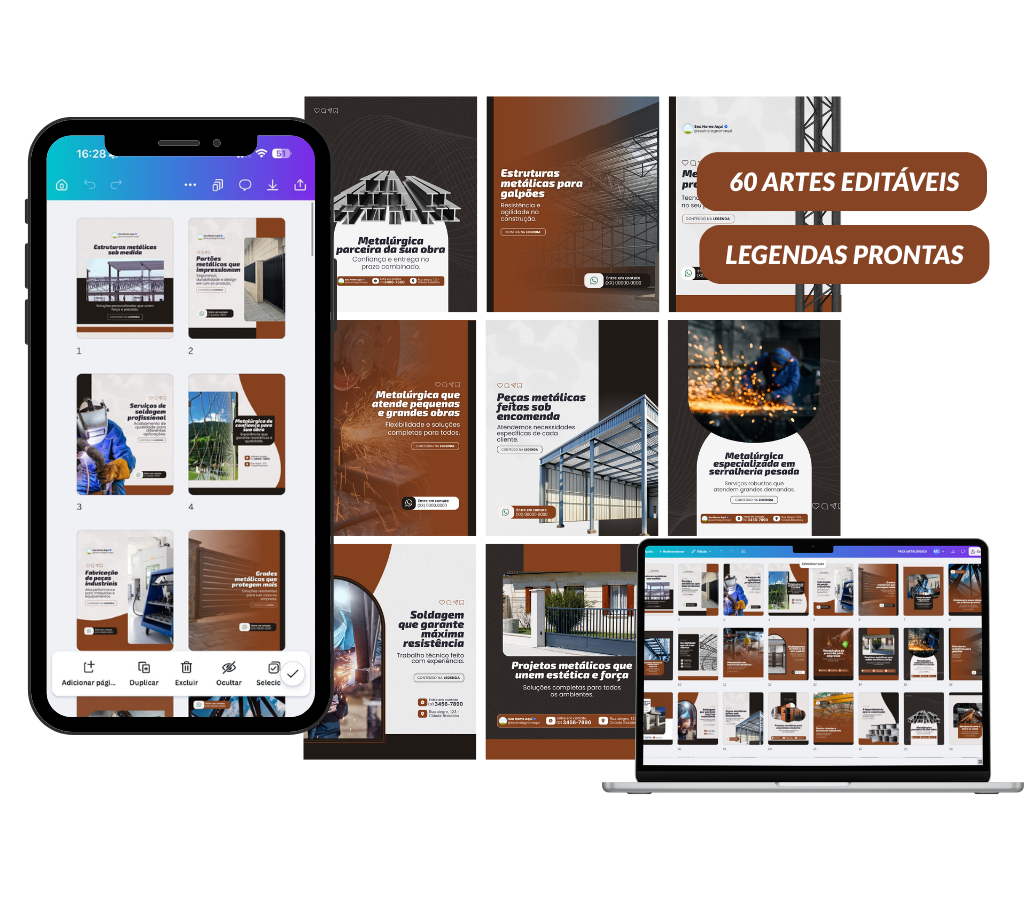 Criamos packs de artes editáveis no Canva para diversas áreas (saúde, beleza, negócios locais, serviços, etc.), sempre com foco em: